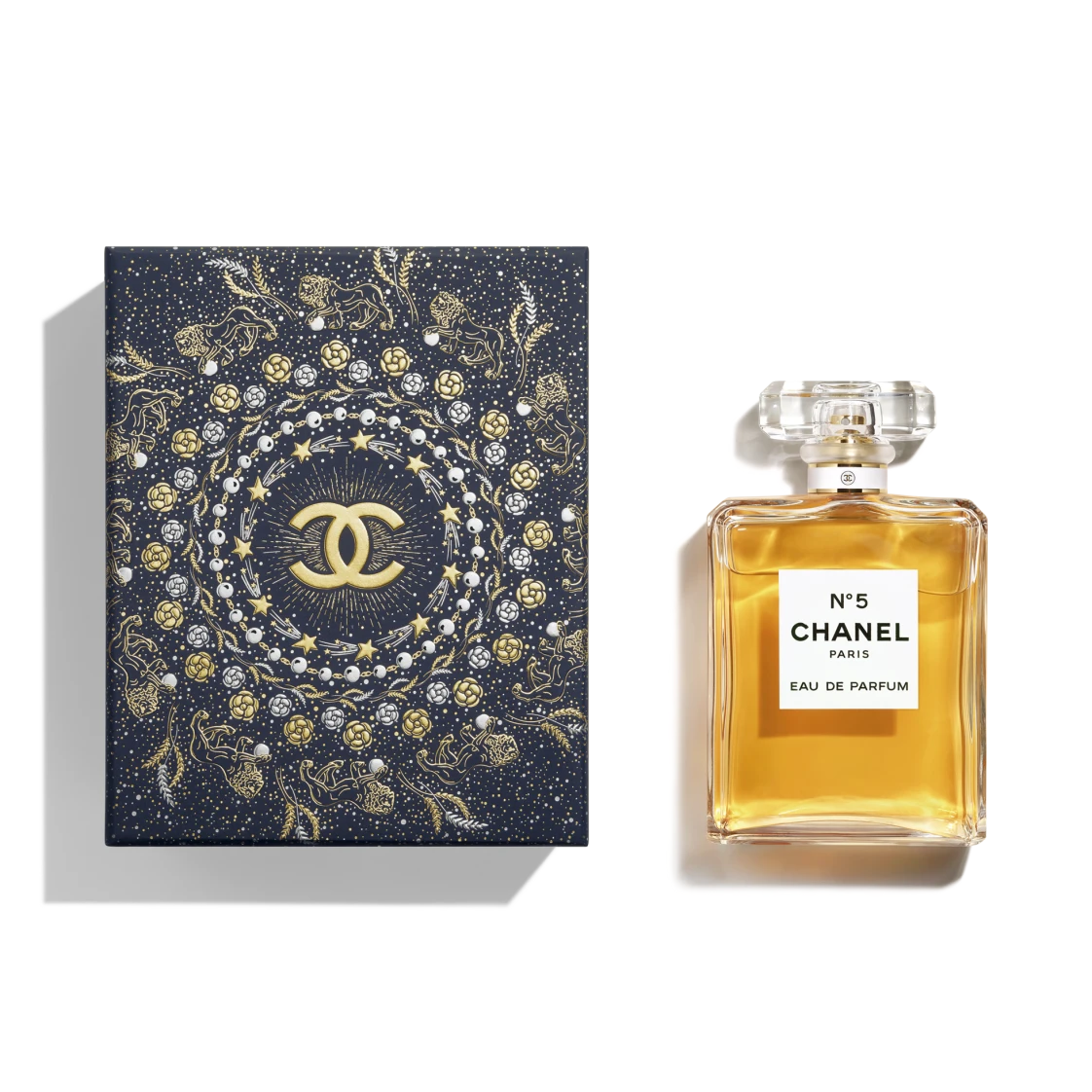 Em 1921, Gabrielle Chanel chama Ernest Beaux para criar “um perfume de mulher com cheiro de mulher”, raro e poderoso. O perfumador lhe propõe uma composição visionária que apela para um uso inédito dos aldeídos. Mademoiselle aprova a versão número 5 da fragrância e decide guardar este número como simples nome. Para este novo produto, ele escolheu um frasco radical, ornamentado com uma etiqueta branca e um cabochão facetado. Em 1986, Jacques Polge, perfumador de CHANEL desde 1978, reinterpreta a divisão olfativa de seu antecessor para apresentar uma versão mais ampla de N°5: a eau de parfum.